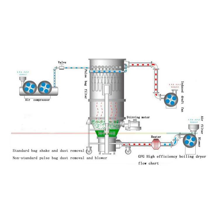 Large-scale boiling dryer is also called flat bed. It consists of air filter, heater, fluidized bed host, feeder, cyclone separator, bag filter, high-pressure centrifugal fan and operating table. Due to the difference in the nature of raw materials, actual needs should be considered when equipping dust removal equipment.
